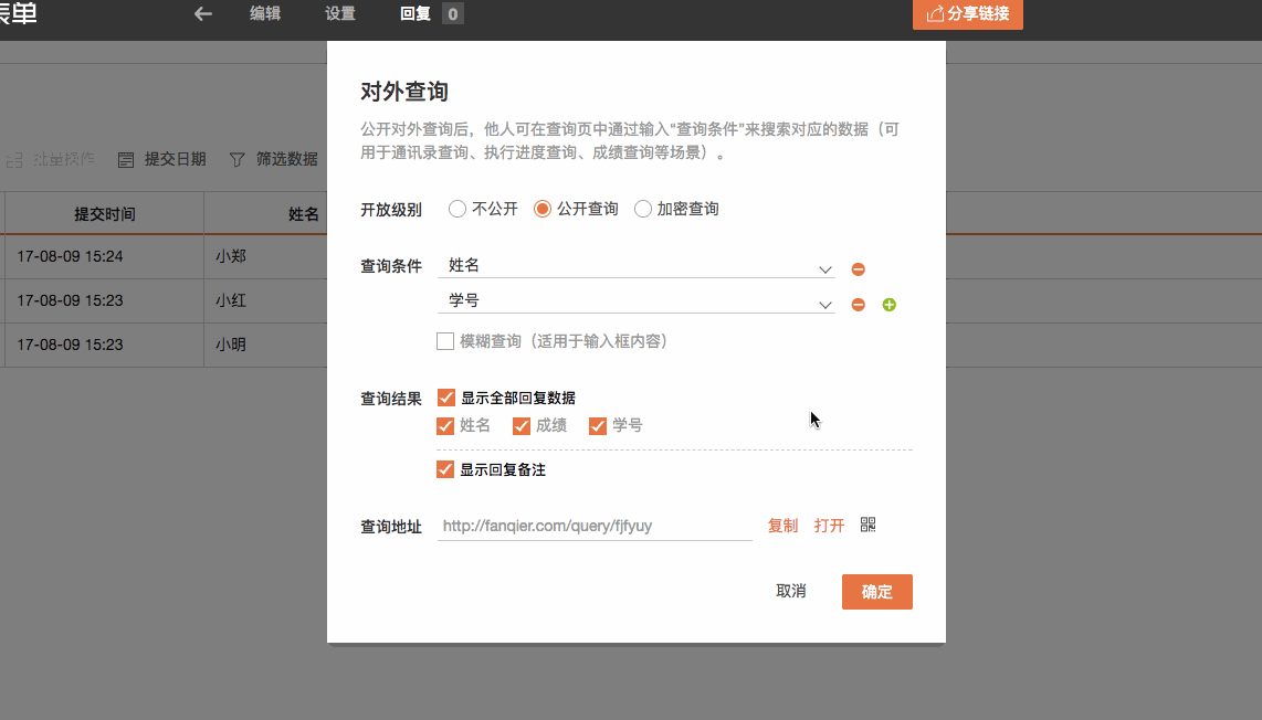 分享查询地址 :对外查询各项设置好后,你可以复制查询地址,或者下载查询地址二维码,点击「确定」,再把地址或二维码分享给需要查询的人员即可