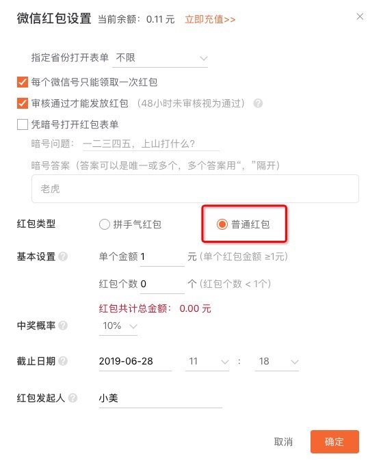 ②普通红包:即定额红包,红包金额=总金额/红包个数,设置普通红包时,总金额必等于或大于红包数量,例如我要发放10个100%中奖的拼手气红包,每个红包的平均金额在1元,那么就设置总金额为10(只要等于或大于10元都行),红包个数为10个。
